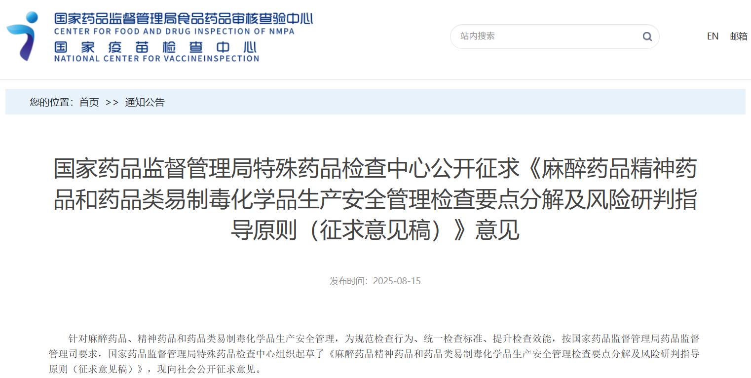国家药品监督管理局特殊药品检查中心公开征求《麻醉药品精神药品和药品类易制毒化学品生产安全管理检查要点分解及风险研判指导原则(征求意见稿)》意见