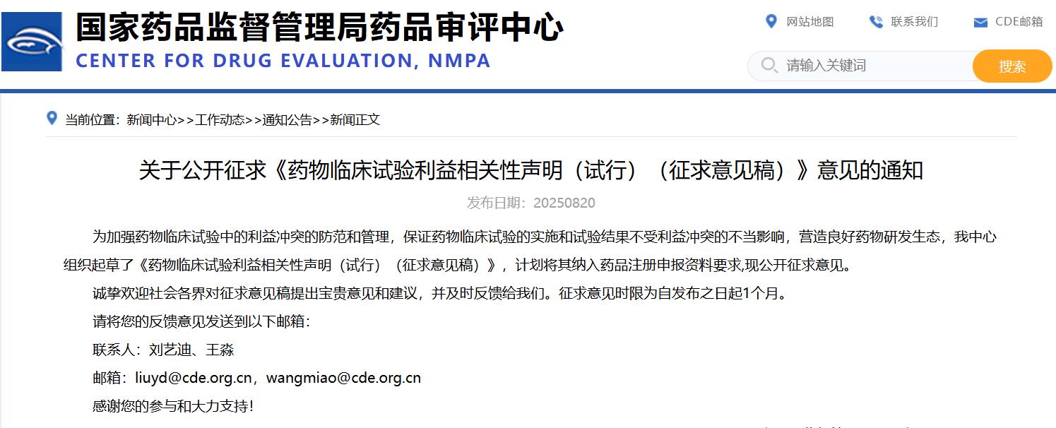 关于公开征求《药物临床试验利益相关性声明(试行)(征求意见稿)》意见的通知