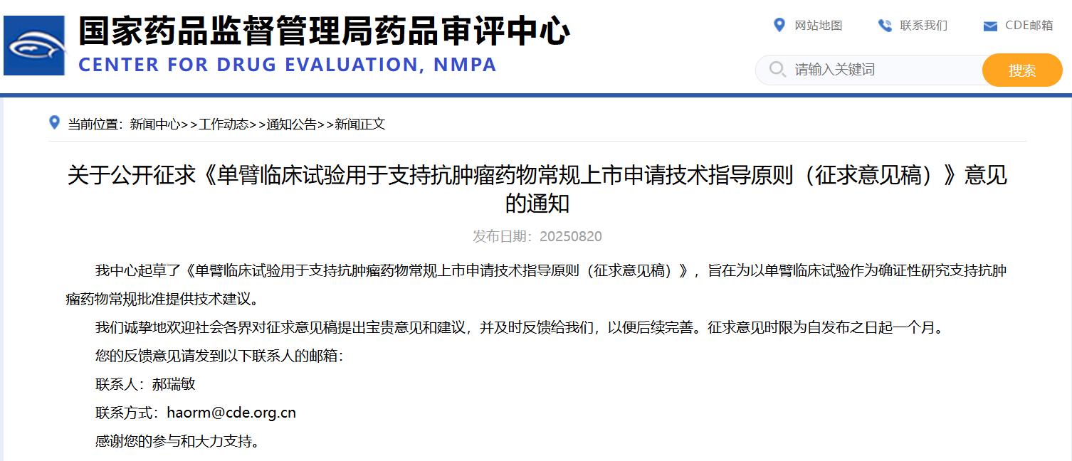 关于公开征求《单臂临床试验用于支持抗肿瘤药物常规上市申请技术指导原则(征求意见稿)》意见的通知