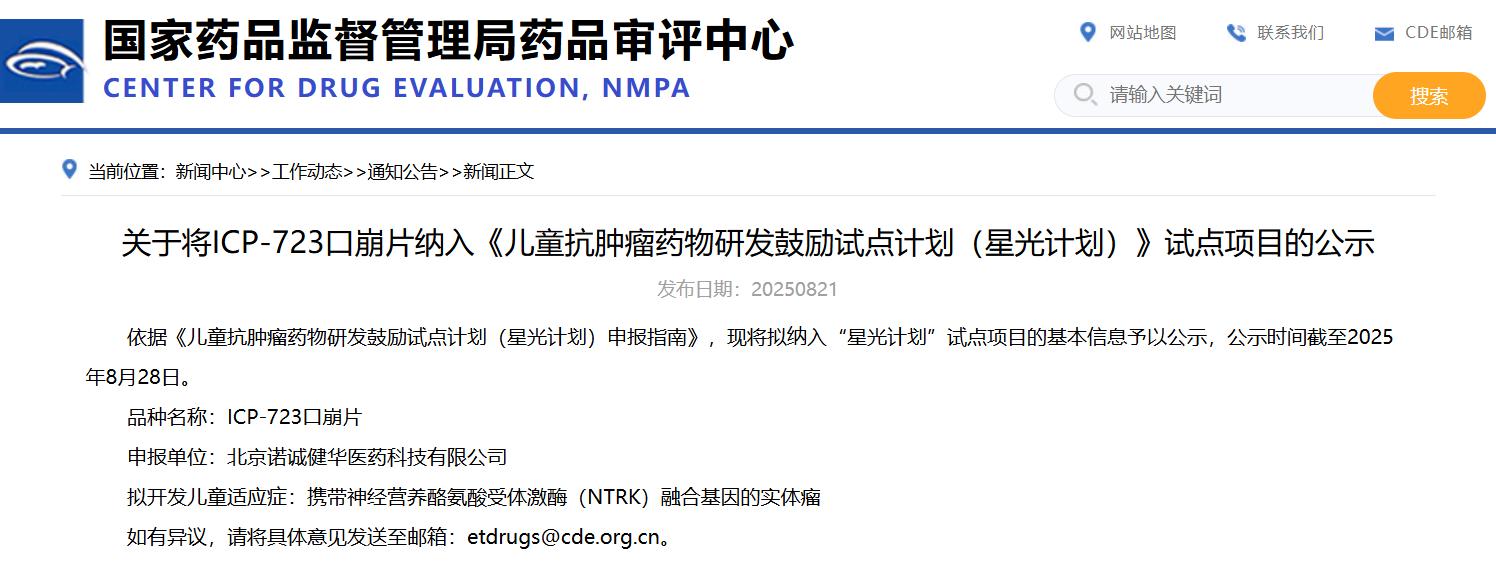 关于将icp-723口崩片纳入《儿童抗肿瘤药物研发鼓励试点计划(星光计划)》试点项目的公示