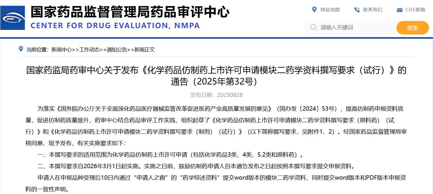 国家药监局药审中心关于发布《化学药品仿制药上市许可申请模块二药学资料撰写要求(试行)》的通告(2025年第32号)