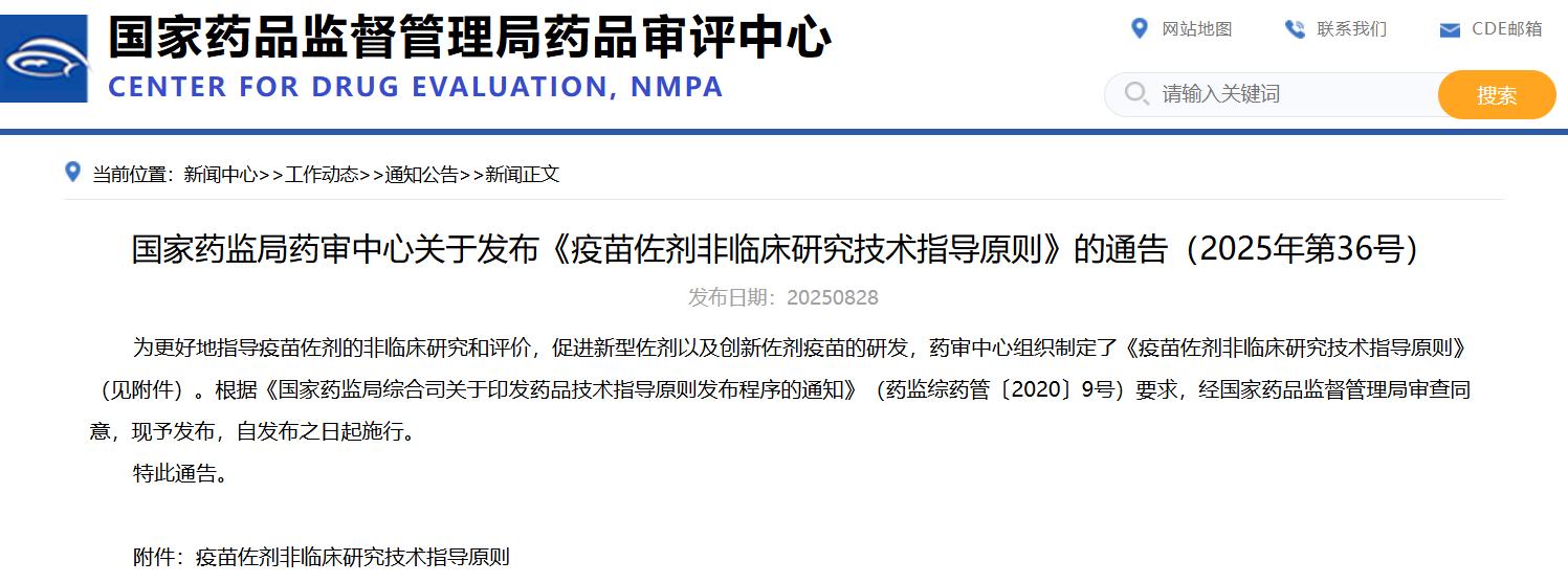 国家药监局药审中心关于发布《疫苗佐剂非临床研究技术指导原则》的通告(2025年第36号)