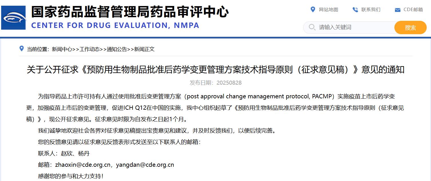 关于公开征求《预防用生物制品批准后药学变更管理方案技术指导原则(征求意见稿)》意见的通知