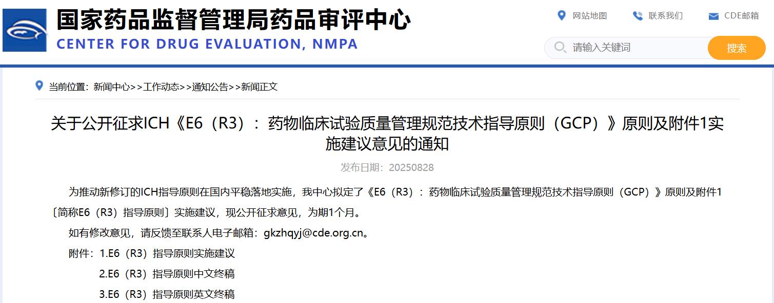 关于公开征求ich《e6(r3):药物临床试验质量管理规范技术指导原则(gcp)》原则及附件1实施建议意见的通知