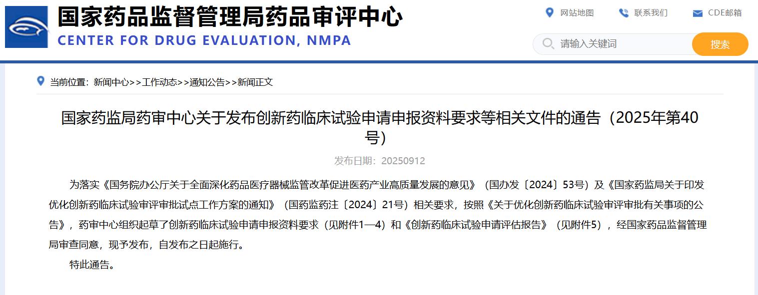 国家药监局药审中心关于发布创新药临床试验申请申报资料要求等相关文件的通告(2025年第40号)