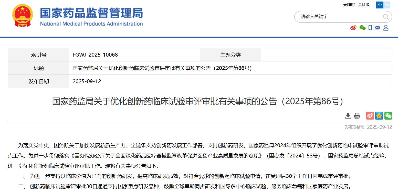 国家药监局关于优化创新药临床试验审评审批有关事项的公告(2025年第86号)