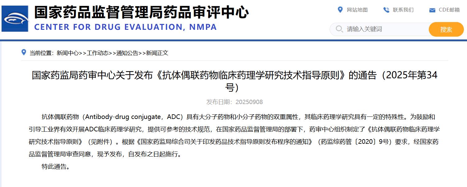 国家药监局药审中心关于发布《抗体偶联药物临床药理学研究技术指导原则》的通告(2025年第34号)