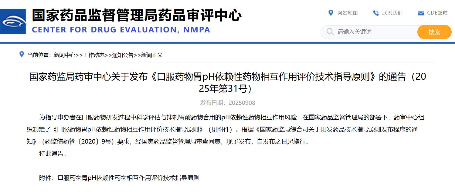 国家药监局药审中心关于发布《口服药物胃ph依赖性药物相互作用评价技术指导原则》的通告(2025年第31号)