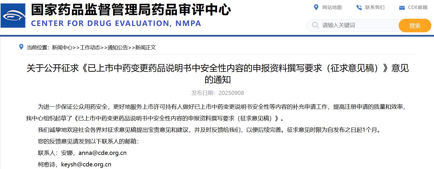 关于公开征求《已上市中药变更药品说明书中安全性内容的申报资料撰写要求(征求意见稿)》意见的通知