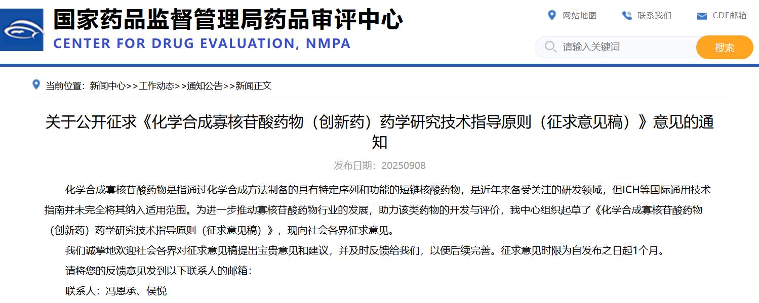 关于公开征求《化学合成寡核苷酸药物(创新药)药学研究技术指导原则(征求意见稿)》意见的通知
