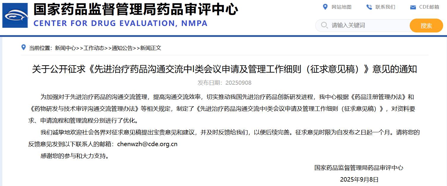 关于公开征求《先进治疗药品沟通交流中i类会议申请及管理工作细则(征求意见稿)》意见的通知