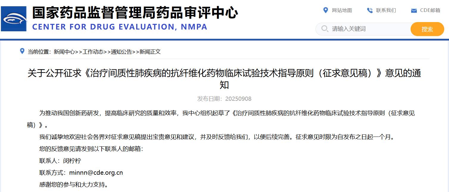 关于公开征求《治疗间质性肺疾病的抗纤维化药物临床试验技术指导原则(征求意见稿)》意见的通知