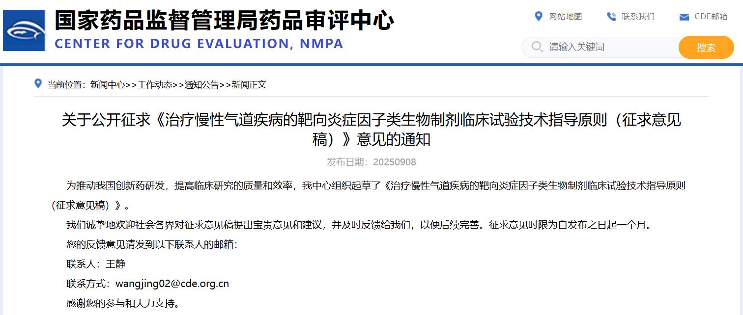 关于公开征求《治疗慢性气道疾病的靶向炎症因子类生物制剂临床试验技术指导原则(征求意见稿)》