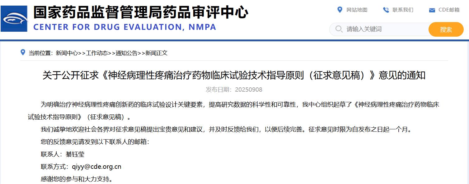关于公开征求《神经病理性疼痛治疗药物临床试验技术指导原则(征求意见稿)》意见的通知