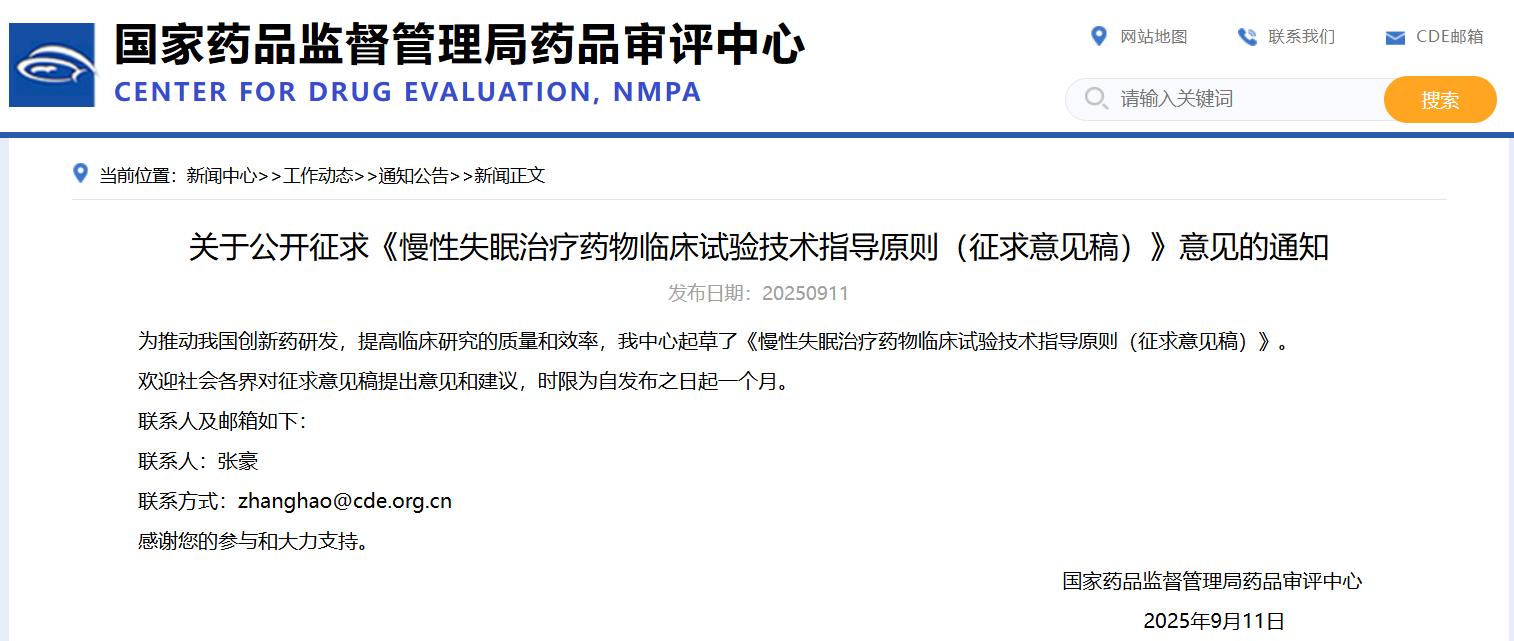 关于公开征求《慢性失眠治疗药物临床试验技术指导原则(征求意见稿)》意见的通知