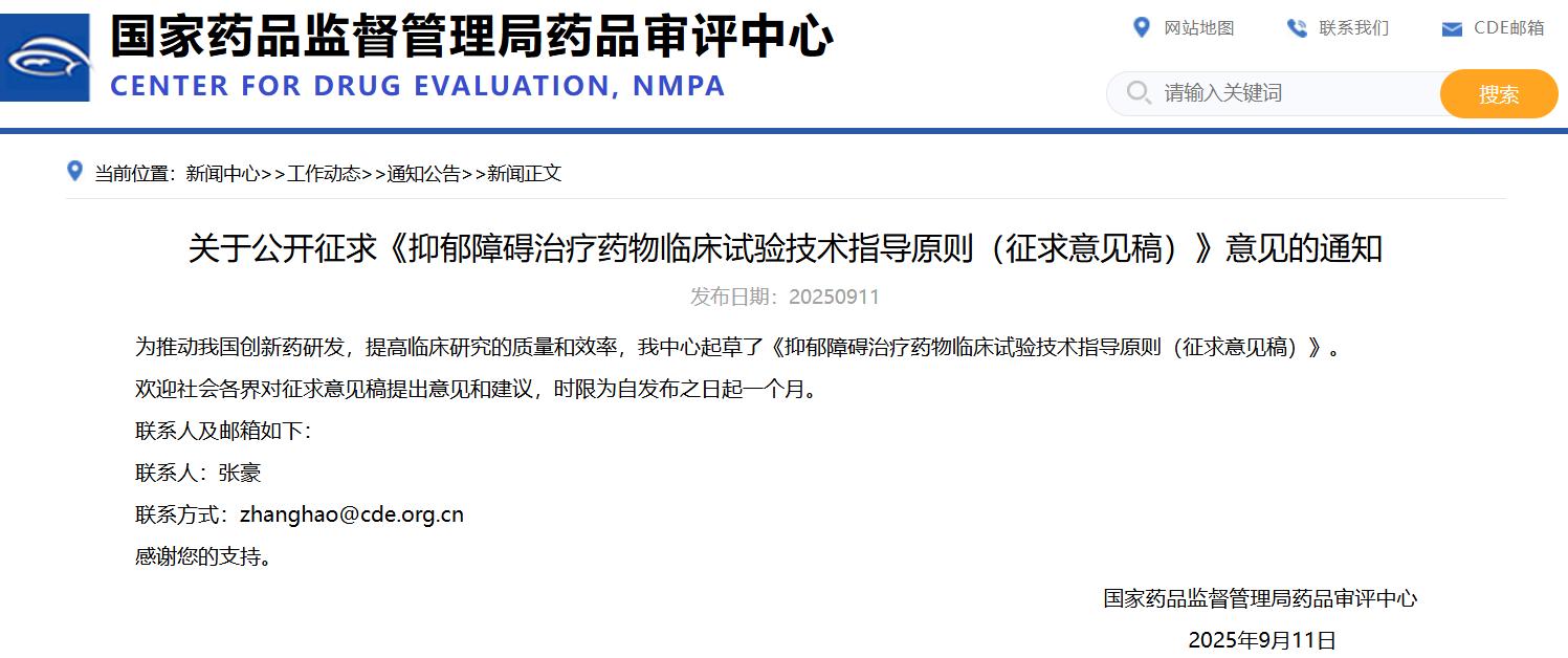 关于公开征求《抑郁障碍治疗药物临床试验技术指导原则(征求意见稿)》意见的通知