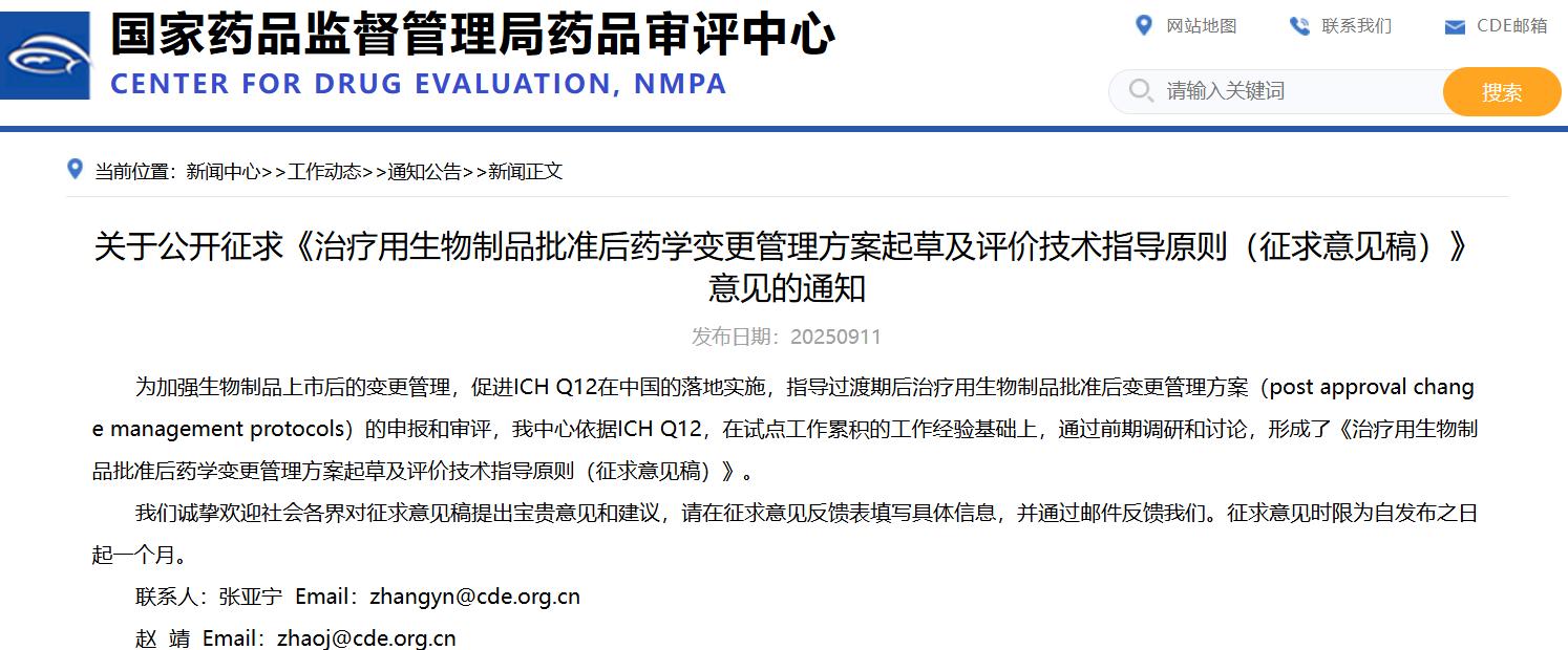 关于公开征求《治疗用生物制品批准后药学变更管理方案起草及评价技术指导原则(征求意见稿)》意见的通知