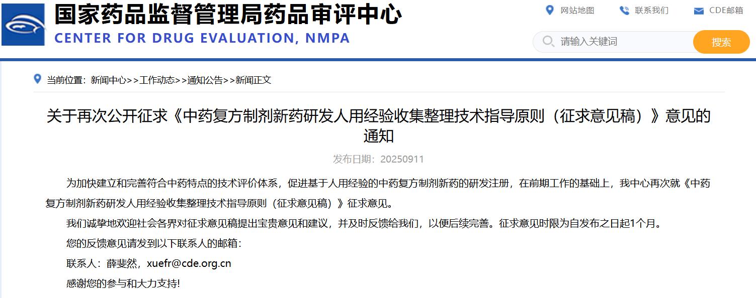 关于再次公开征求《中药复方制剂新药研发人用经验收集整理技术指导原则(征求意见稿)》意见的通知
