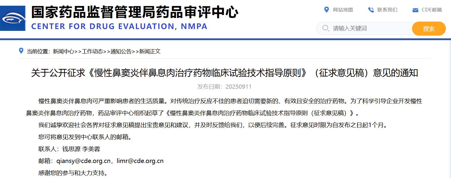 关于公开征求《慢性鼻窦炎伴鼻息肉治疗药物临床试验技术指导原则》(征求意见稿)意见的通知