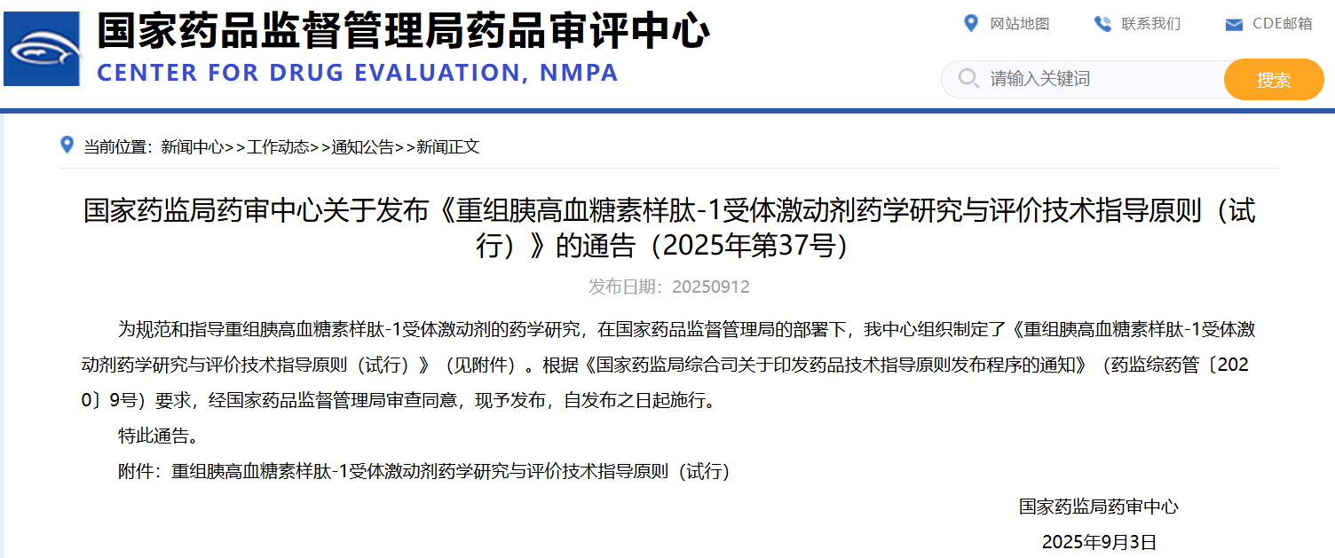 国家药监局药审中心关于发布《重组胰高血糖素样肽-1受体激动剂药学研究与评价技术指导原则(试行)》的通告(2025年第37号)