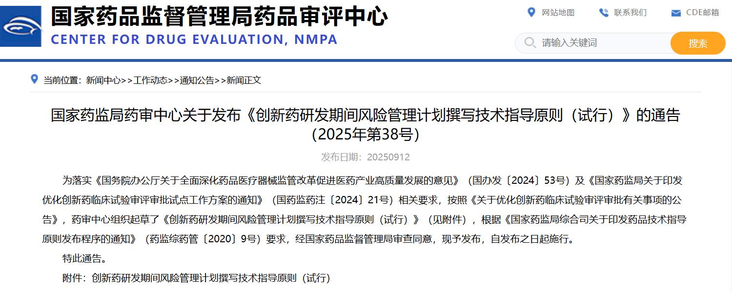 国家药监局药审中心关于发布《创新药研发期间风险管理计划撰写技术指导原则(试行)》的通告(2025年第38号)