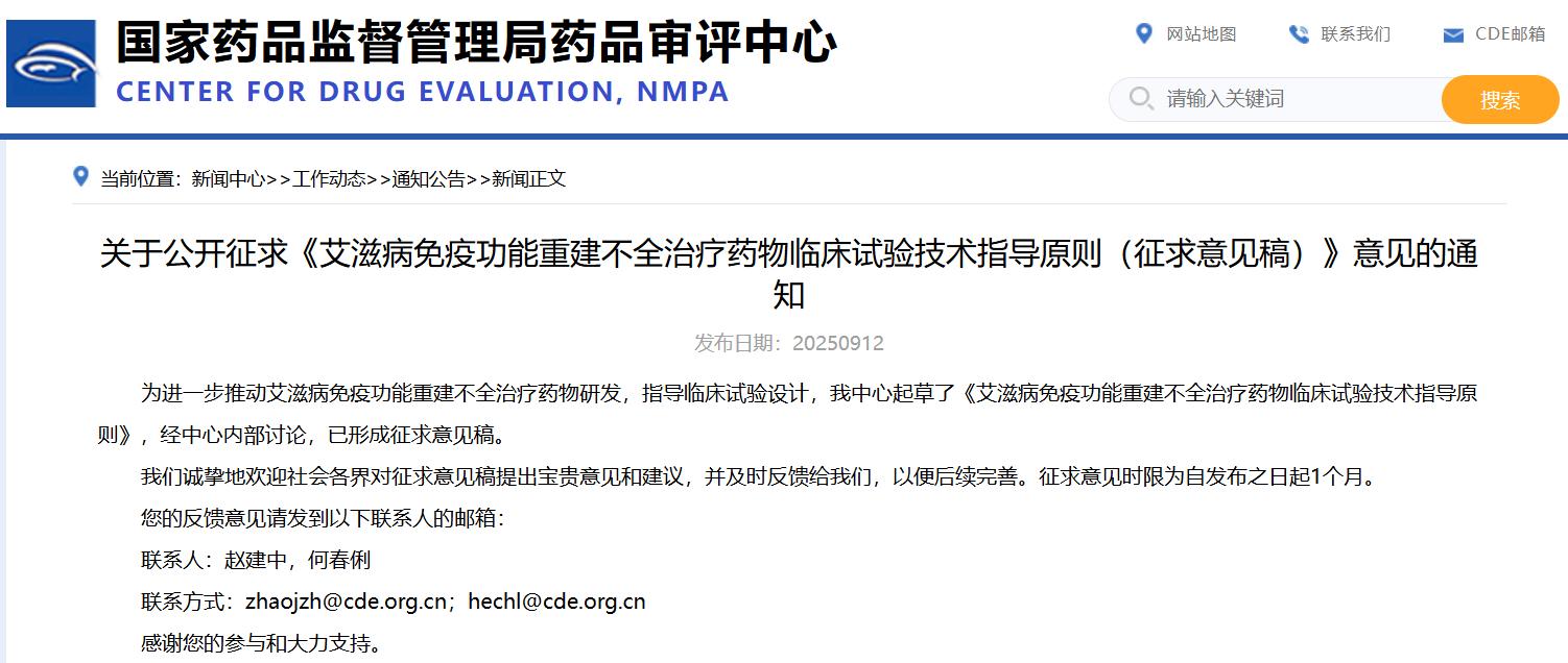 关于公开征求《艾滋病免疫功能重建不全治疗药物临床试验技术指导原则(征求意见稿)》意见的通知