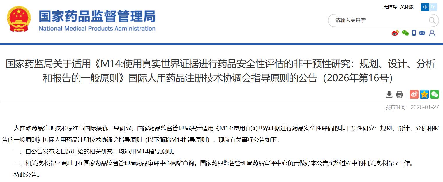 国家药监局关于适用《m14:使用真实世界证据进行药品安全性评估的非干预性研究:规划、设计、分析和报告的一般原则》国际人用药品 注册技术协调会指导原则的公告(2026年第16号)