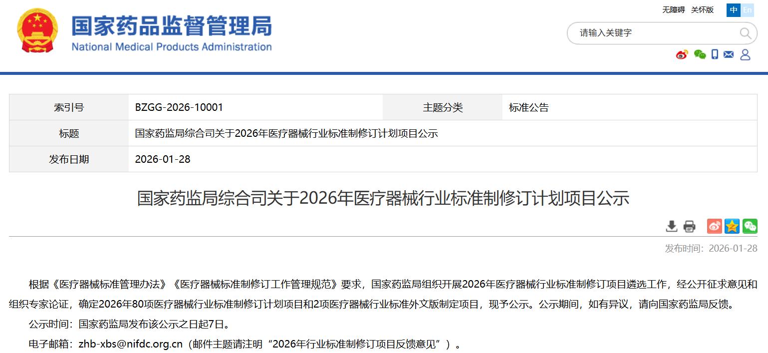 国家药监局综合司关于2026年医疗器械行业标准制修订计划项目公示
