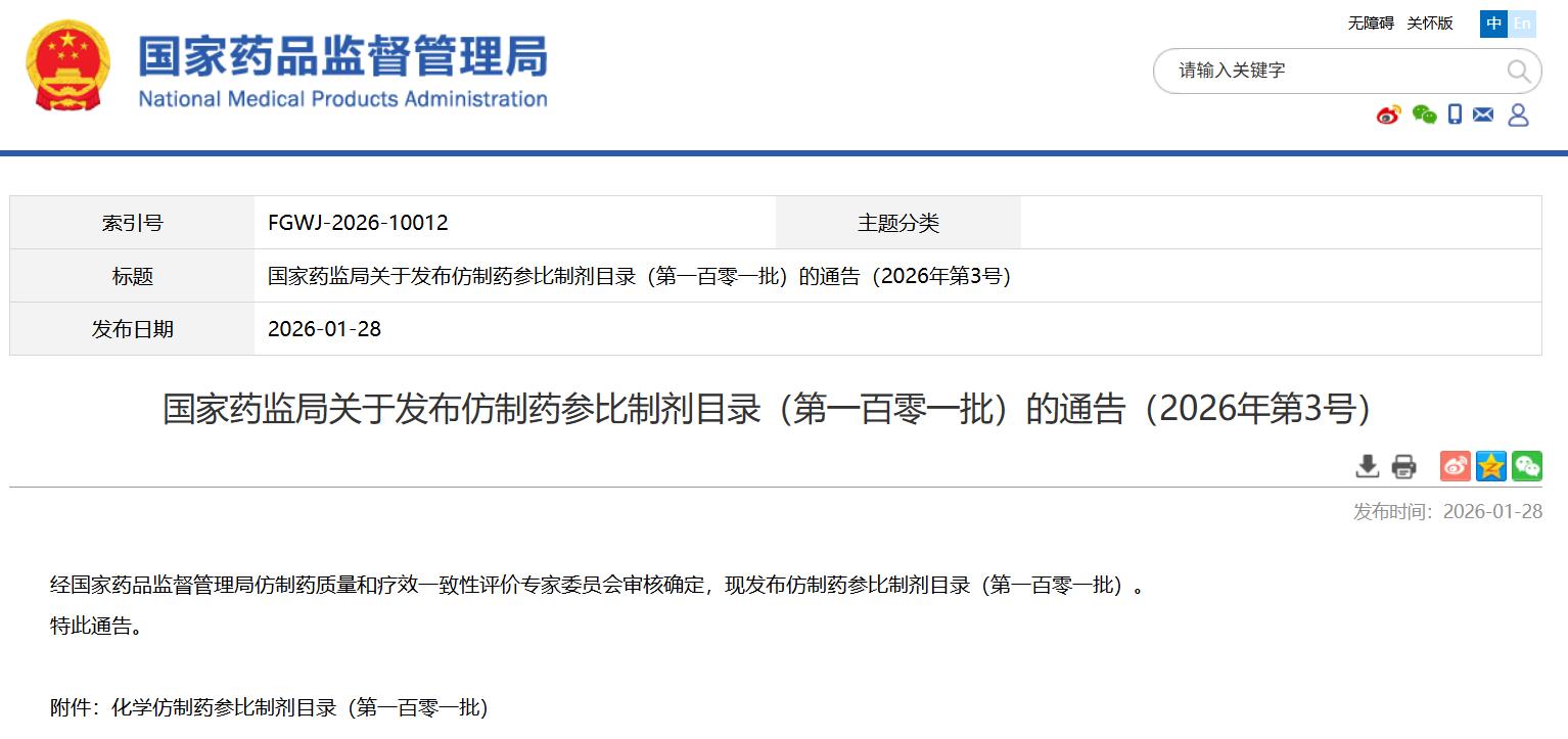 国家药监局关于发布仿制药参比制剂目录(第一百零一批)的通告(2026年第3号)