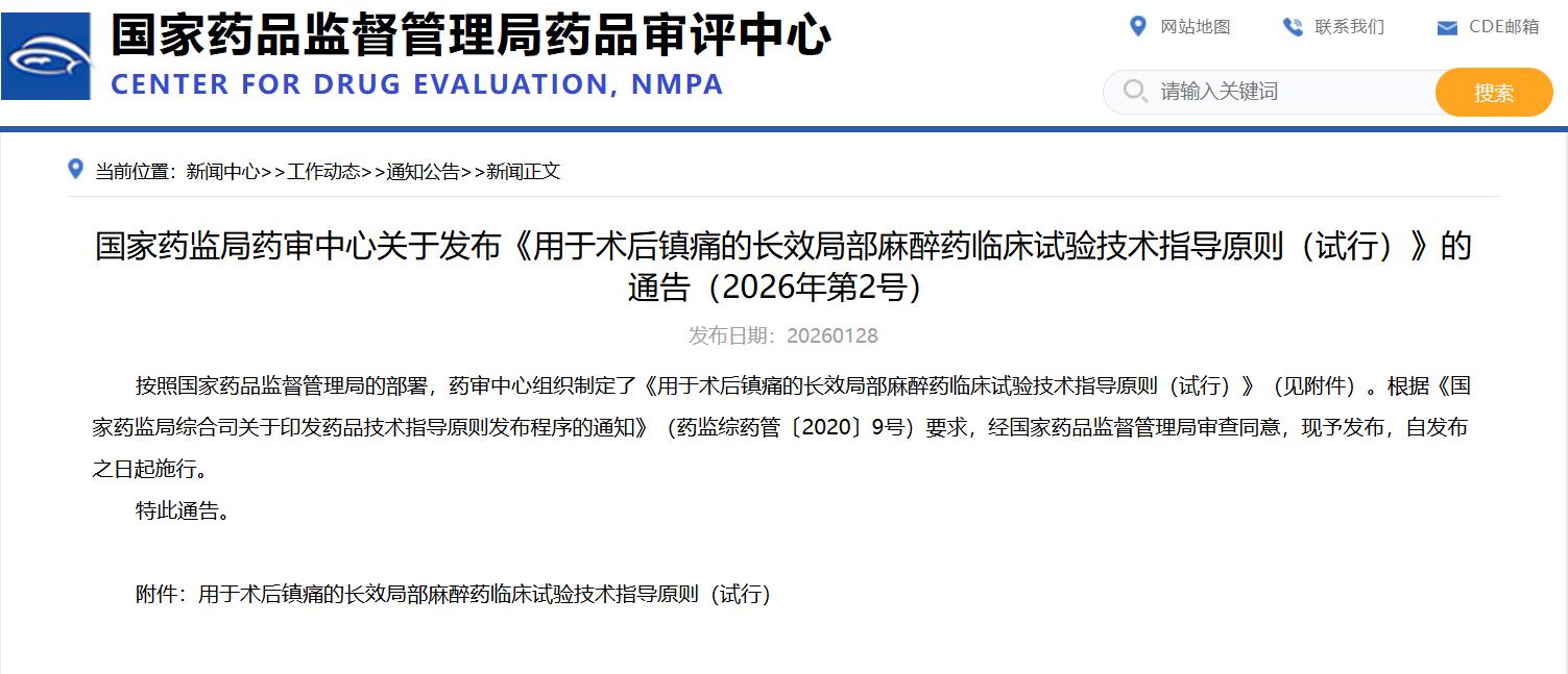 国家药监局药审中心关于发布《用于术后镇痛的长效局部麻醉药临床试验技术指导原则(试行)》的通告(2026年第2号)