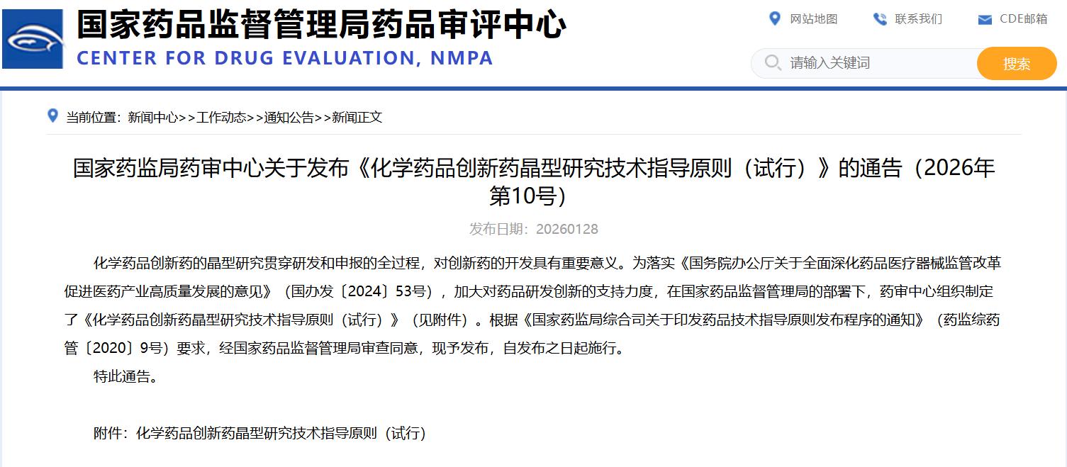 国家药监局药审中心关于发布《化学药品创新药晶型研究技术指导原则(试行)》的通告(2026年第10号)