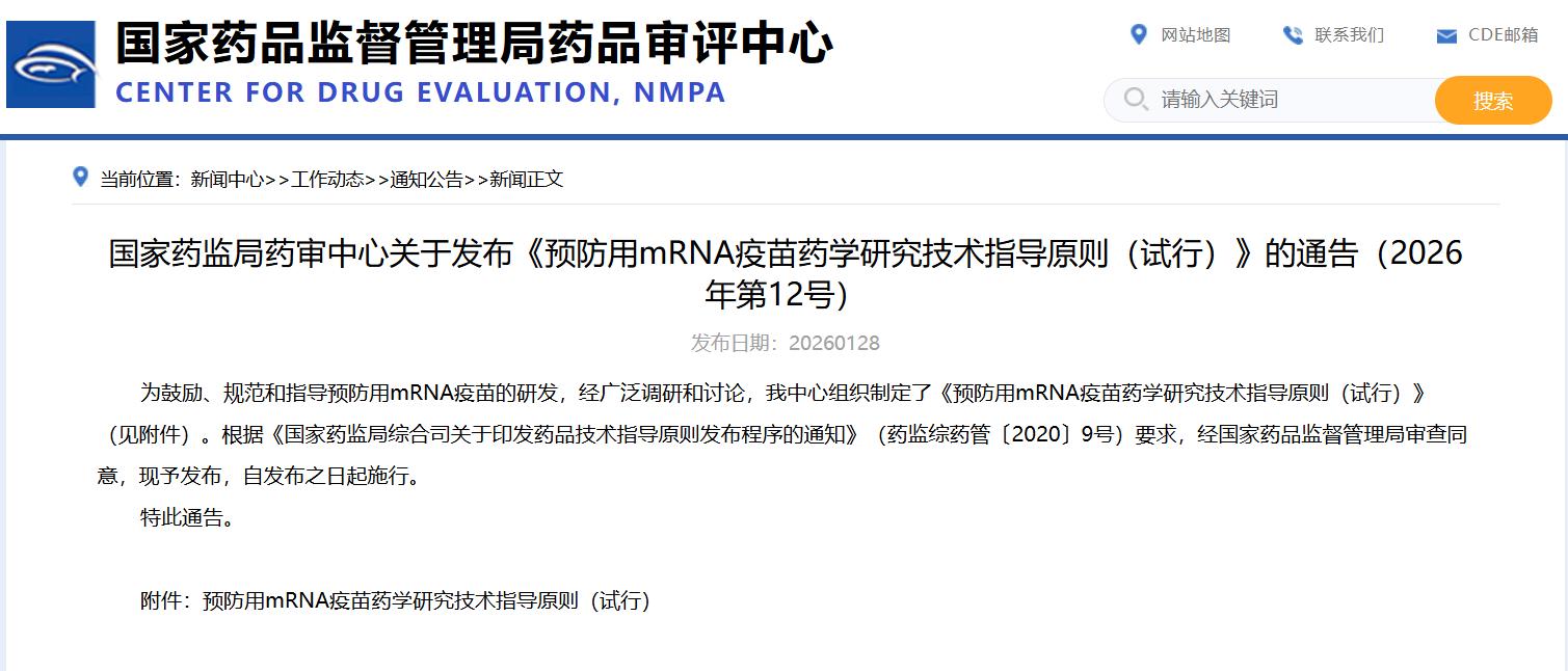 国家药监局药审中心关于发布《预防用mrna疫苗药学研究技术指导原则(试行)》的通告(2026年第12号)
