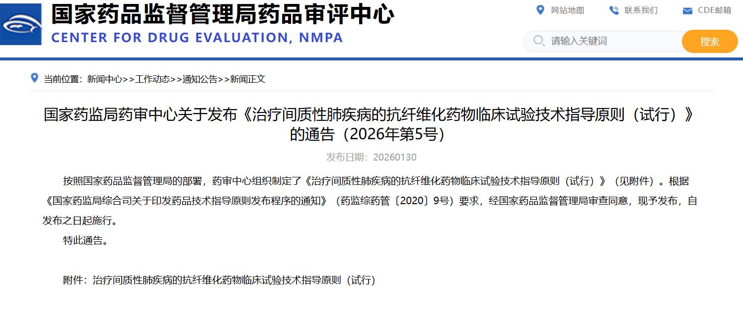 国家药监局药审中心关于发布《治疗间质性肺疾病的抗纤维化药物临床试验技术指导原则(试行)》的通告(2026年第5号)