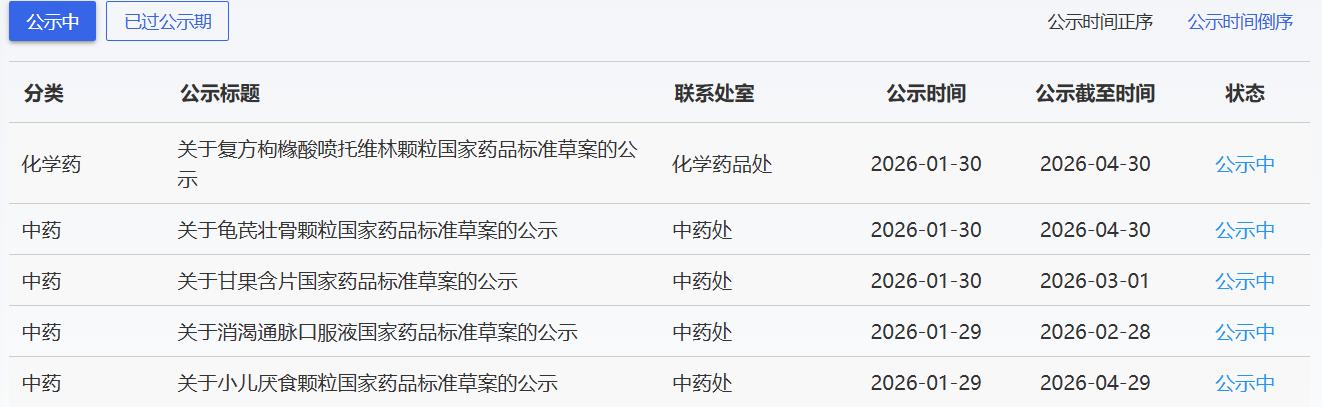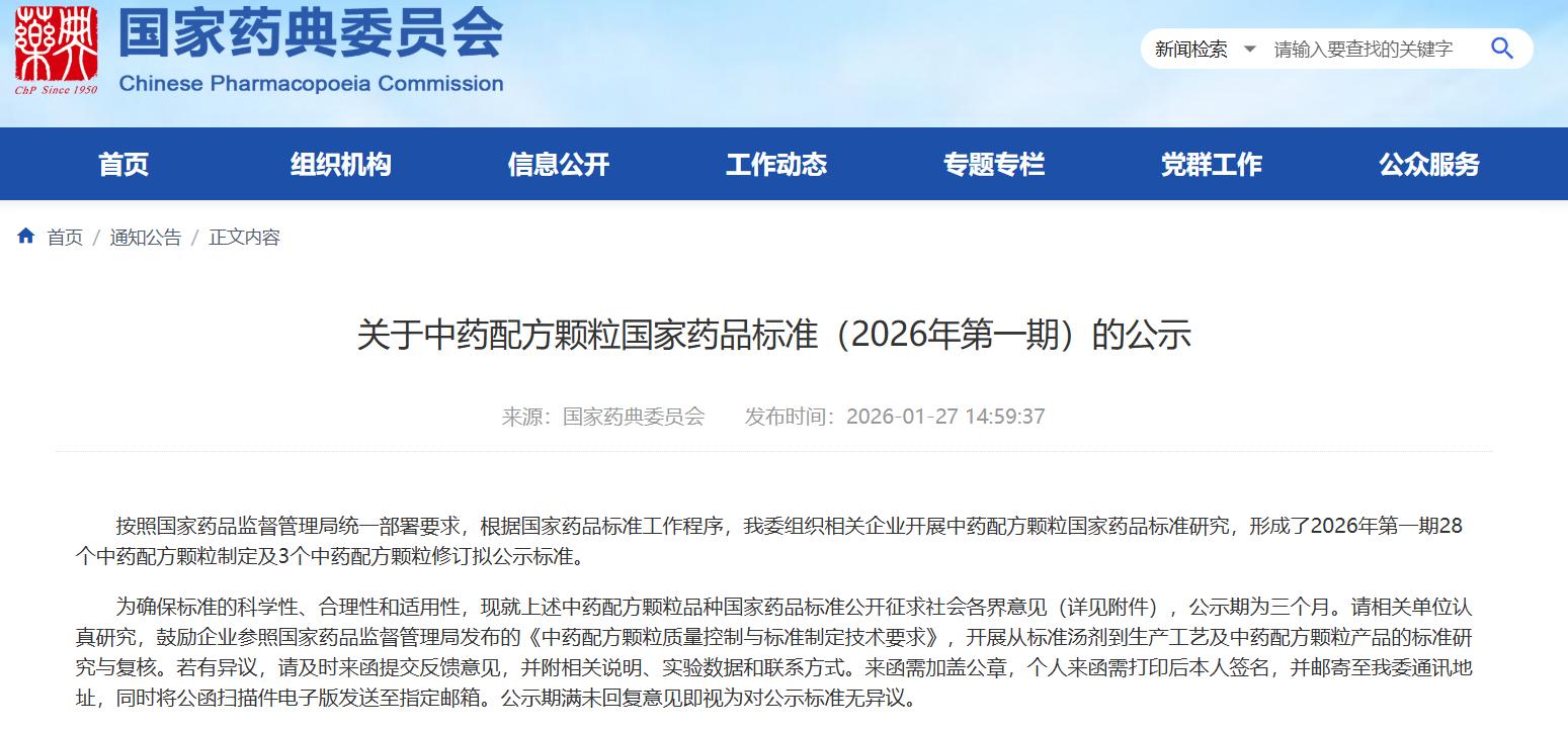 关于中药配方颗粒国家药品标准(2026年第一期)的公示