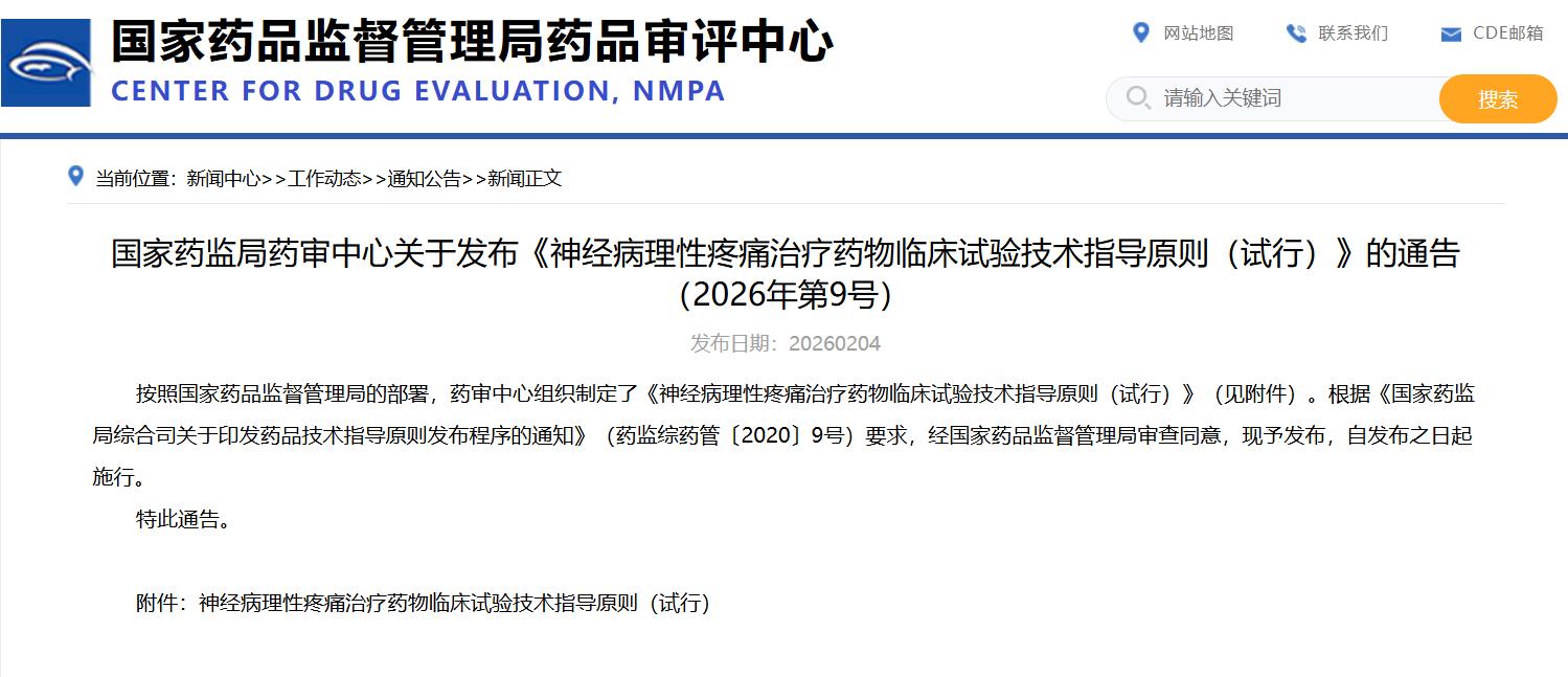 国家药监局药审中心关于发布《神经病理性疼痛治疗药物临床试验技术指导原则(试行)》的通告(2026年第9号)