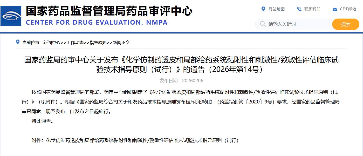 国家药监局药审中心关于发布《化学仿制药透皮和局部给药系统黏附性和刺激性/致敏性评估临床试验技术指导原则(试行)》的通告(2026年第14号)