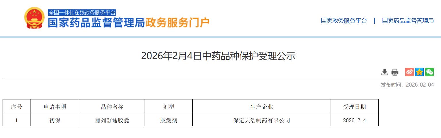 2026年2月4日中药品种保护受理公示