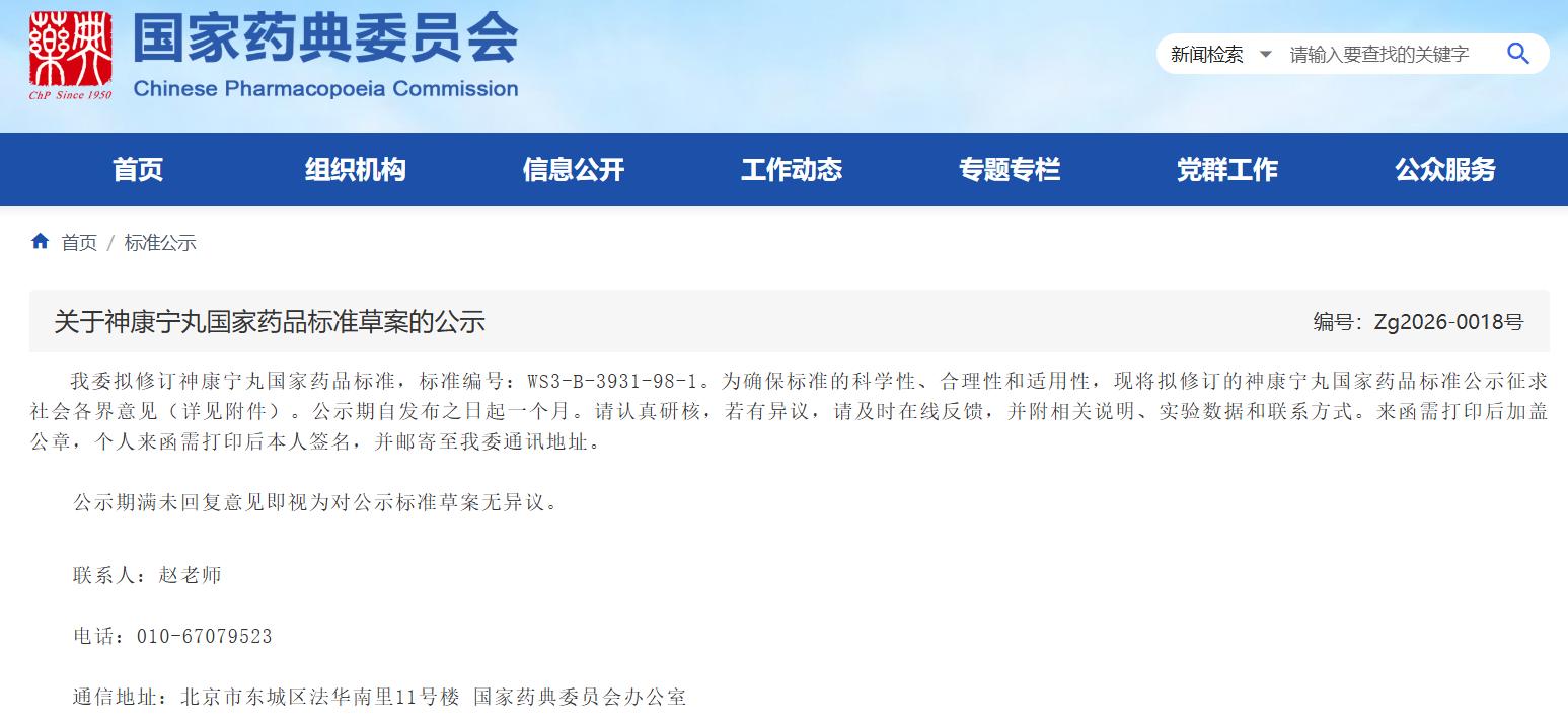 关于神康宁丸国家药品标准草案的公示