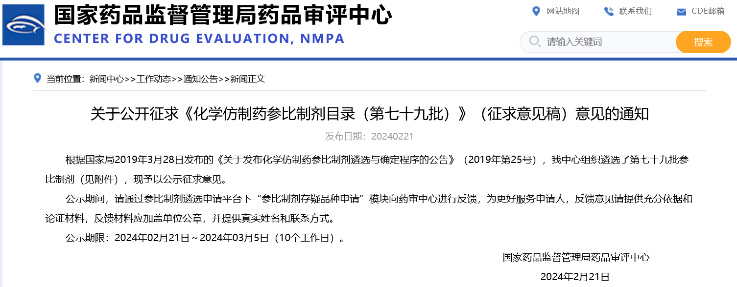 关于公开征求《化学仿制药参比制剂目录(第七十九批)》(征求意见稿)意见的通知