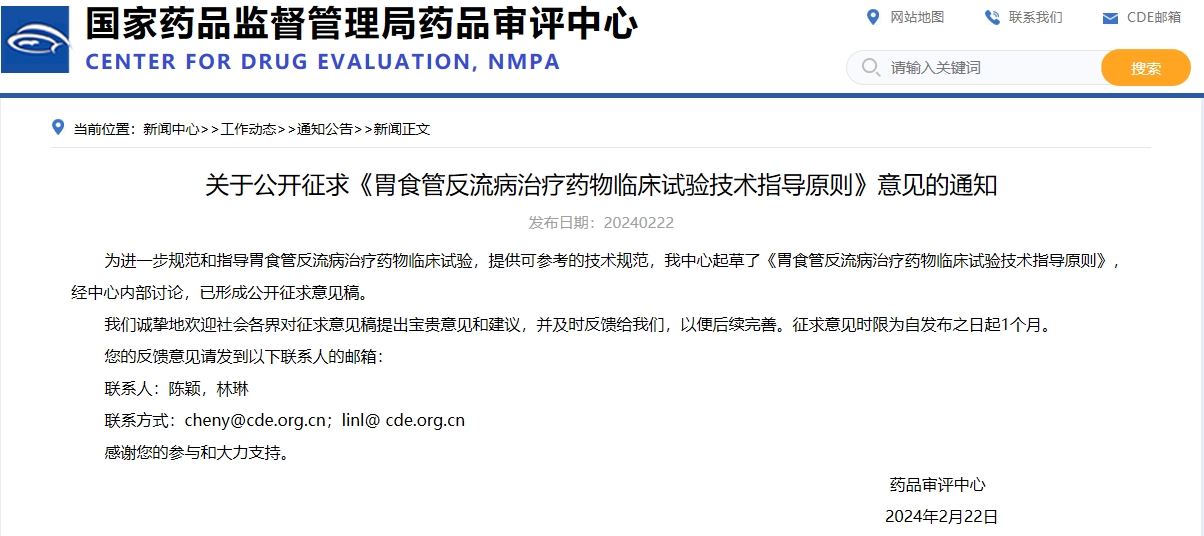 关于公开征求《胃食管反流病治疗药物临床试验技术指导原则》意见的通知