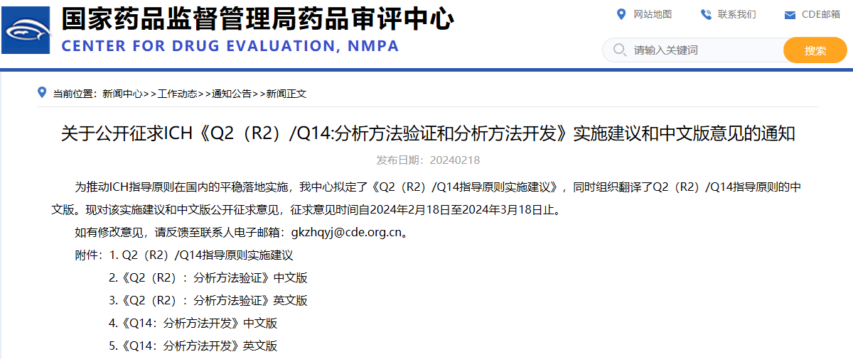 关于公开征求ich《q2(r2)/q14:分析方法验证和分析方法开发》实施建议和中文版意见的通知