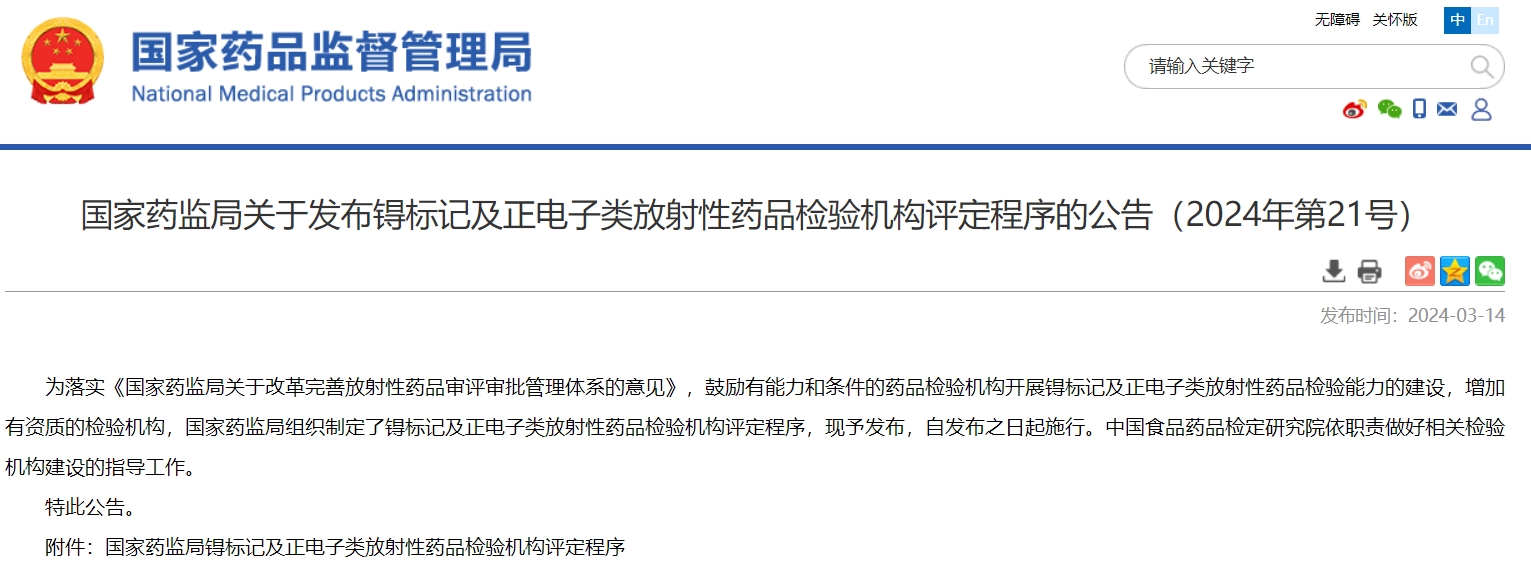 国家药监局关于发布锝标记及正电子类放射性药品检验机构评定程序的公告(2024年第21号)