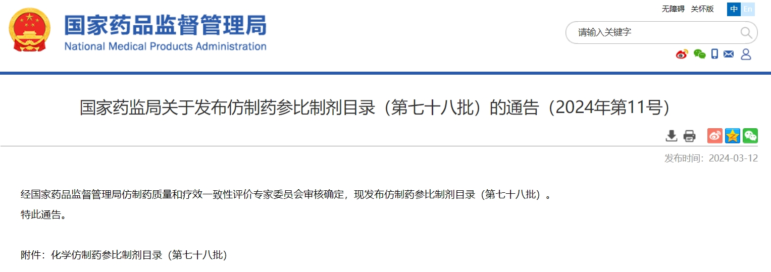 国家药监局关于发布仿制药参比制剂目录(第七十八批)的通告(2024年第11号)