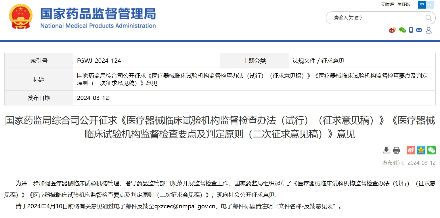 国家药监局综合司公开征求《医疗器械临床试验机构监督检查办法(试行)(征求意见稿)》《医疗器械临床试验机构监督检查要点及判定原则(二次征求意见稿)》意见