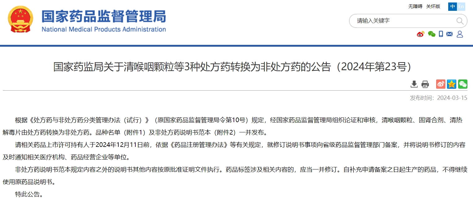 国家药监局关于清喉咽颗粒等3种处方药转换为非处方药的公告(2024年第23号)