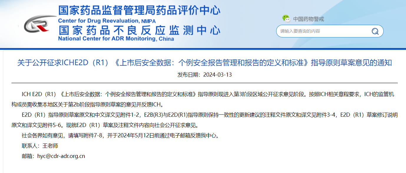 关于公开征求iche2d(r1)《上市后安全数据:个例安全报告管理和报告的定义和标准》指导原则草案意见的通知