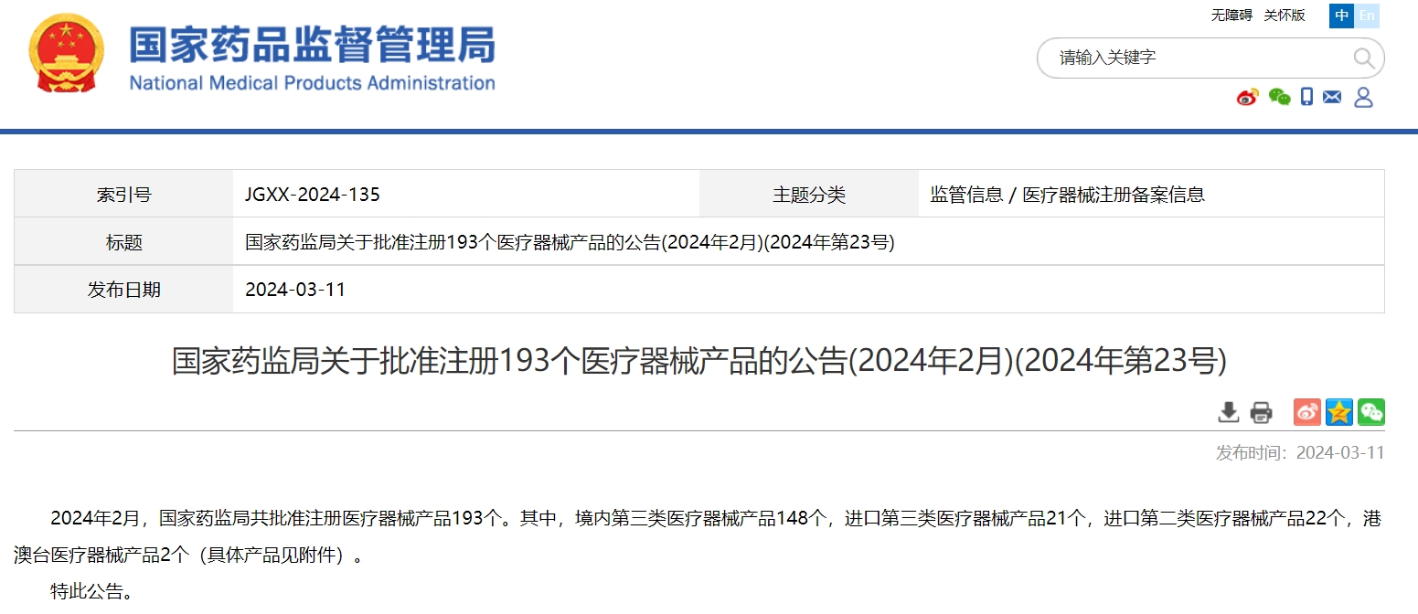 国家药监局关于批准注册193个医疗器械产品的公告(2024年2月)(2024年第23号)