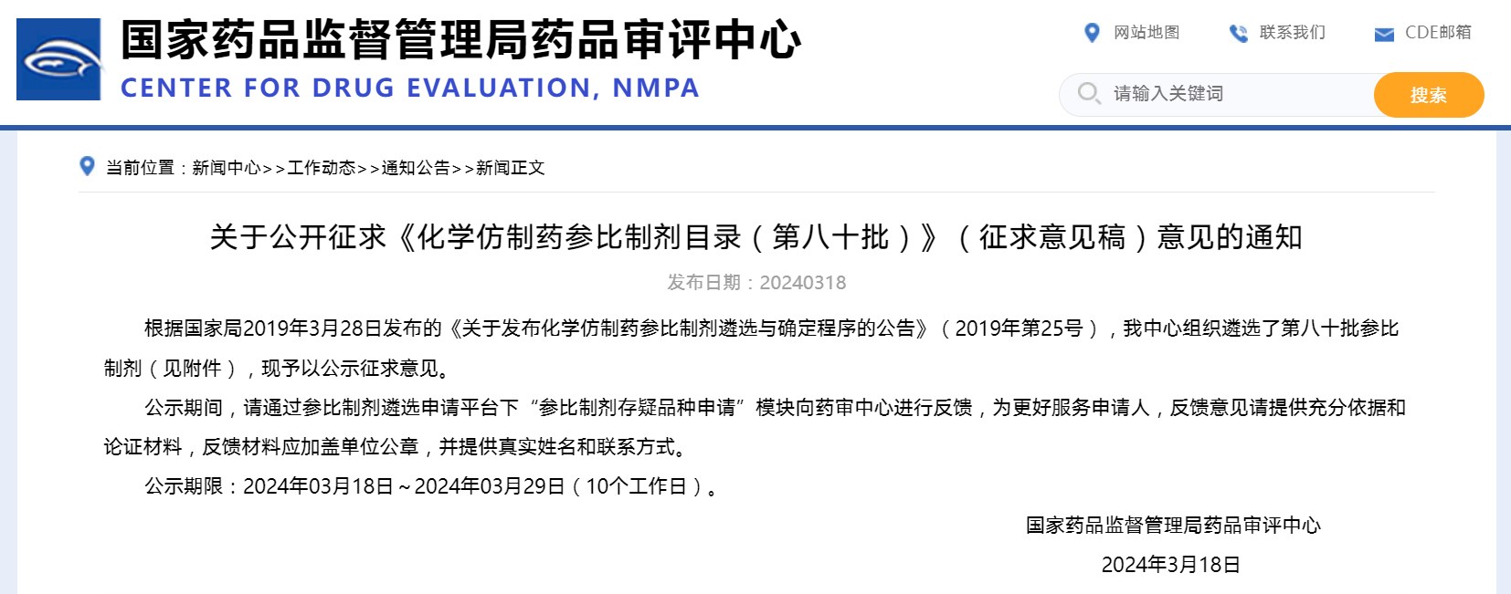 关于公开征求《化学仿制药参比制剂目录(第八十批)》(征求意见稿)意见的通知