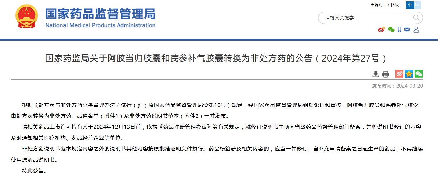 国家药监局关于阿胶当归胶囊和芪参补气胶囊转换为非处方药的公告(2024年第27号)