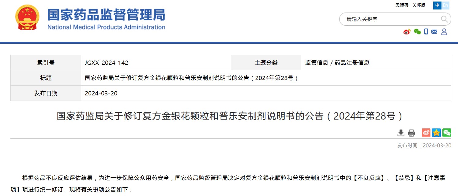 国家药监局关于修订复方金银花颗粒和普乐安制剂说明书的公告(2024年第28号)